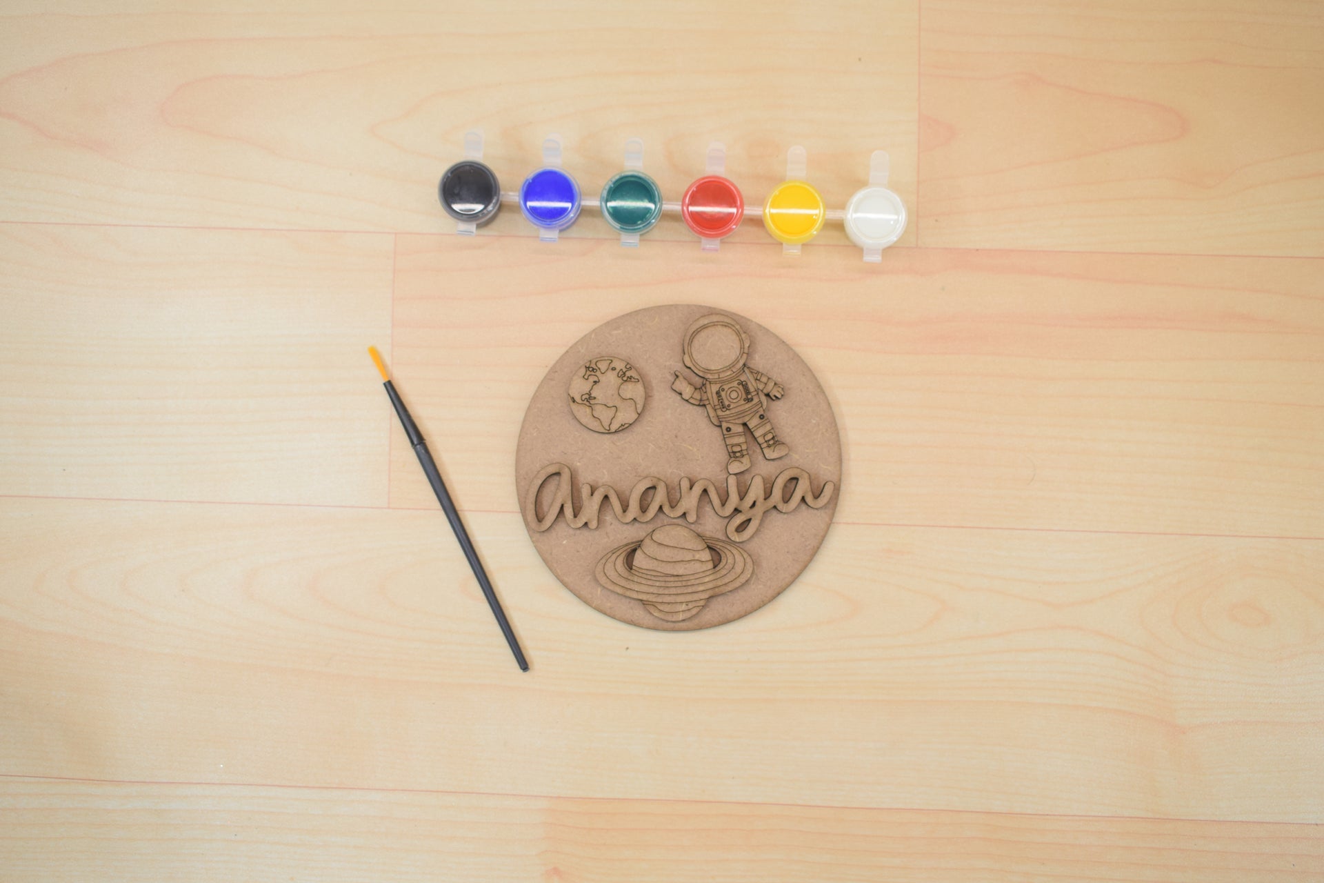 Ignite curiosity and creativity with our Astronaut Space Theme Name Plate, a personalized DIY painting kit for kids that brings space dreams to life. Featuring a laser-engraved astronaut, planet Saturn, and Earth with the child’s name cut out in a beautiful script, this round wooden nameplate is both a fun activity and a lasting keepsake.
